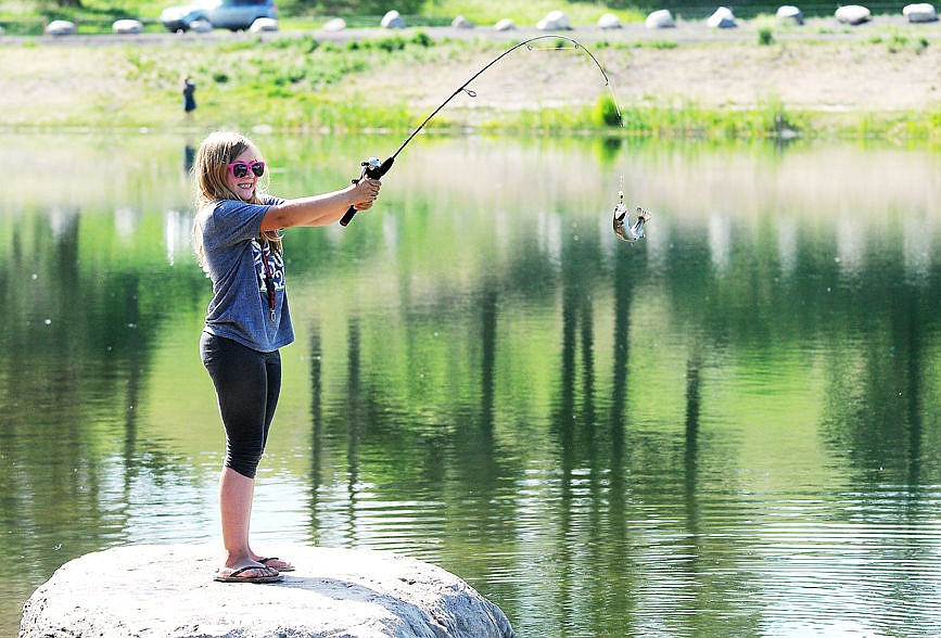 Nine-year-old Nicole Reikofski-Baker holds up the fish she caught during the Cops and Bobbers event at Pine Grove Pond on Wednesday. (Aaric Bryan/Daily Inter Lake)