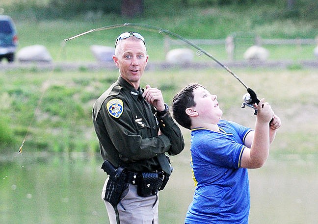 Montana Highway Patrolman John Underwood helps Bailey Hylton as he cast during the Cops and Bobbers event at Pine Grove Pond on Wednesday. (Aaric Bryan/Daily Inter Lake)