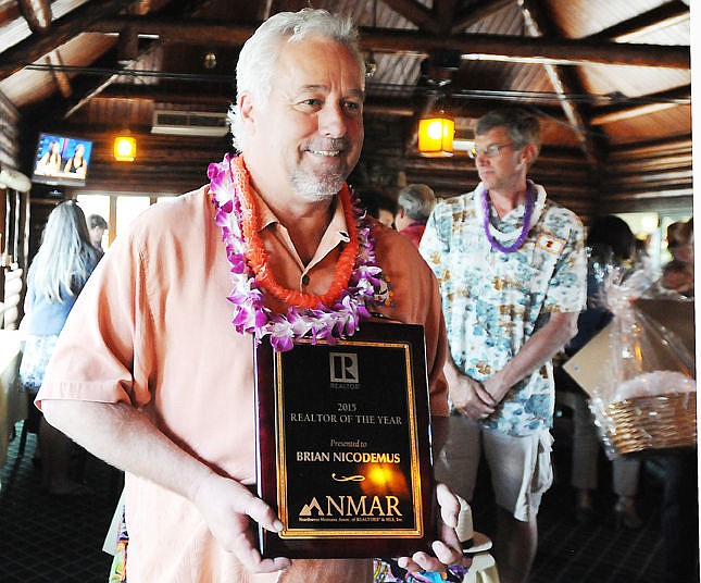Brian Nicodemus holds his 2015 Realtor of the Year plaque during the Northwest Montana Association of Realtors awards banquet at Buffalo Hills Golf Course on Wednesday. (Aaric Bryan/Daily Inter Lake)