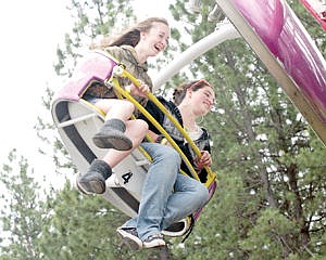 Erin Jager, left, and Crystal Haines aboard Paradise Carnival's "Paratrooper" Saturday during Logger Days 2013.