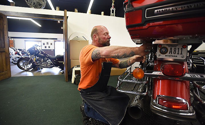 Dam Herstein of H & H Tikes begins to convert a Harley Davidson motorcycle into a customized trike on Wednesday, June 10, at his shop in Kalispell. (Brenda Ahearn/Daily Inter Lake)