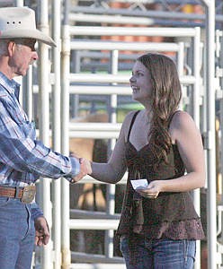 Shannon Rowberry receives a $1,000 scholarship check from Brett Bronson Saturday evening during Incredi-Bull 2015.