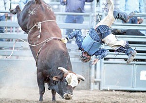 Ian Shafer of Columbia Falls has a not-so-graceful exit from the bull known as "Tom Cat" during Incredi-Bull 2015 at J. Neils Park Saturday night.