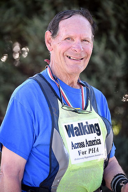 Don Stevenson, The "Pacing Parson," pauses for a portrait along U.S. 2 on Monday morning, June 15, in Evergreen. Stevenson, a former United States Marine, is walking from Auburn, Washington to Silver Springs, Maryland for the Pulmonary Hypertension Association.