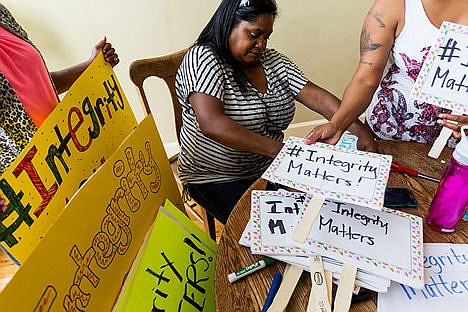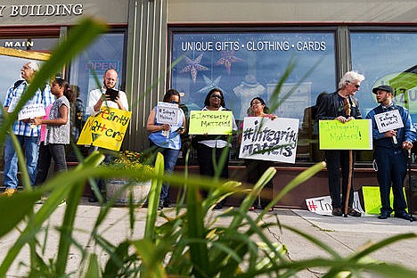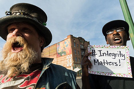 A couple dozen people attended the rally with signs that said "#Integrity Matters."