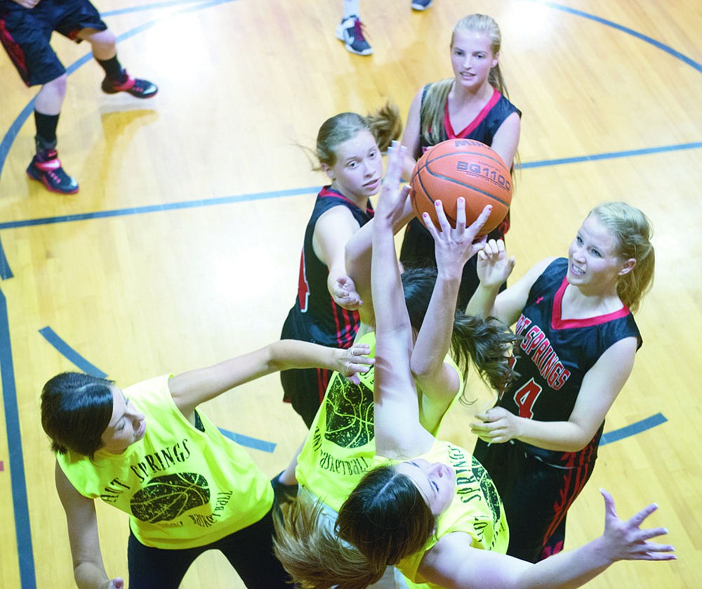 Competitors scramble for the basketball during the Fourth Annual Hot Springs High School Graduation Matters Alumni Game.
