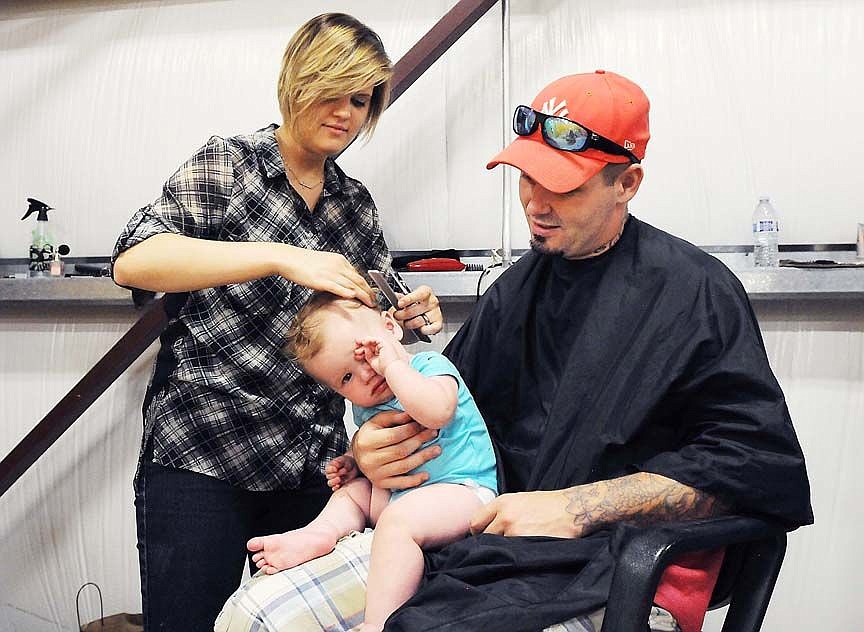 Eleven-month-old Justin Junior Ellman cries in his dad Justin Ellman's lap as Rebecca Martin of Soucie Soucie Salon cuts his hair during Project Homeless Connect on Wednesday. Hair cutting was just one of many services provided for people that are homeless or at risk of becoming homeless. (Aaric Bryan/Daily Inter Lake)