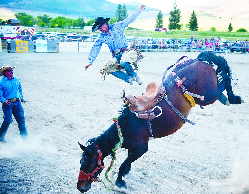 A bronco removes a cowboy from his saddle during the 66th Annual Homesteaders Days Rodeo.