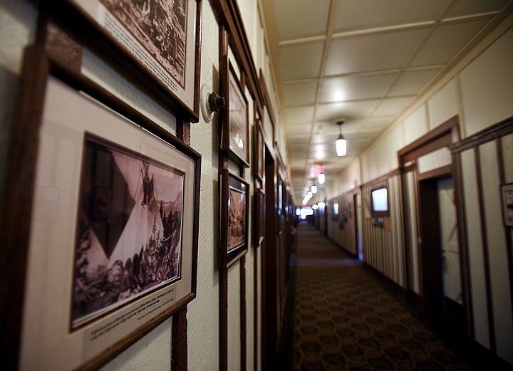 A hallway lined with historic photos, modern photos and art at the Many Glacier Hotel on Tuesday, June 16, in Glacier National Park. (Brenda Ahearn/Daily Inter Lake)