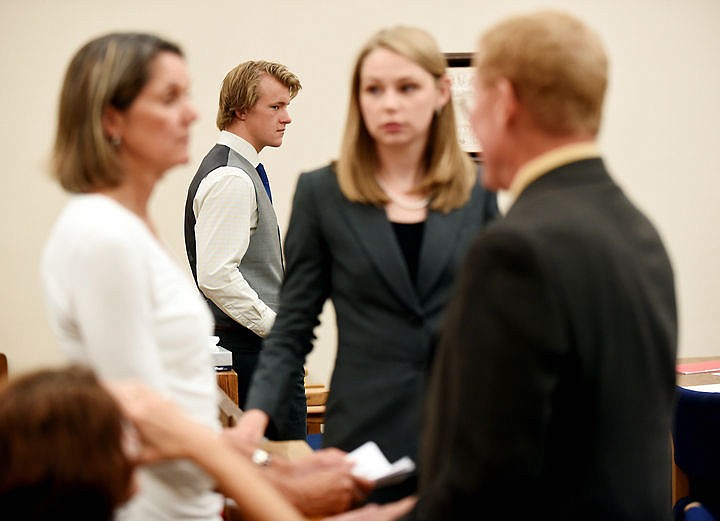 Susan Cahill speaks with prosecutors Stacy Boman anbd Ed Corrigan during a break in the sentencing hearing Wednesday for Zachary Klundt, in background. Klundt is being sentenced for destroying Cahill's medical clinic in March 2014.