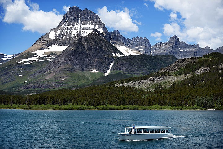 Chief Two Guns, a historic wooden boat, makes it's way across Swiftcurrent Lake on Tuesday, June 16, in Glacier National Park. (Brenda Ahearn/Daily Inter Lake)