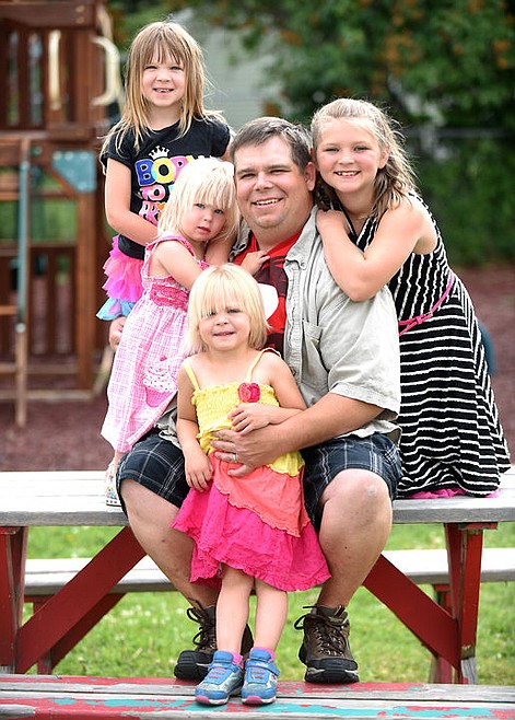 Portrait of Chris Derozier with his daughters from top: Abigail, 5, Charlotte, 10, Sophia, 2, and Olivia, 3, at the playground at New Frontier on Thursday morning, June 18. (Brenda Ahearn/Daily Inter Lake)