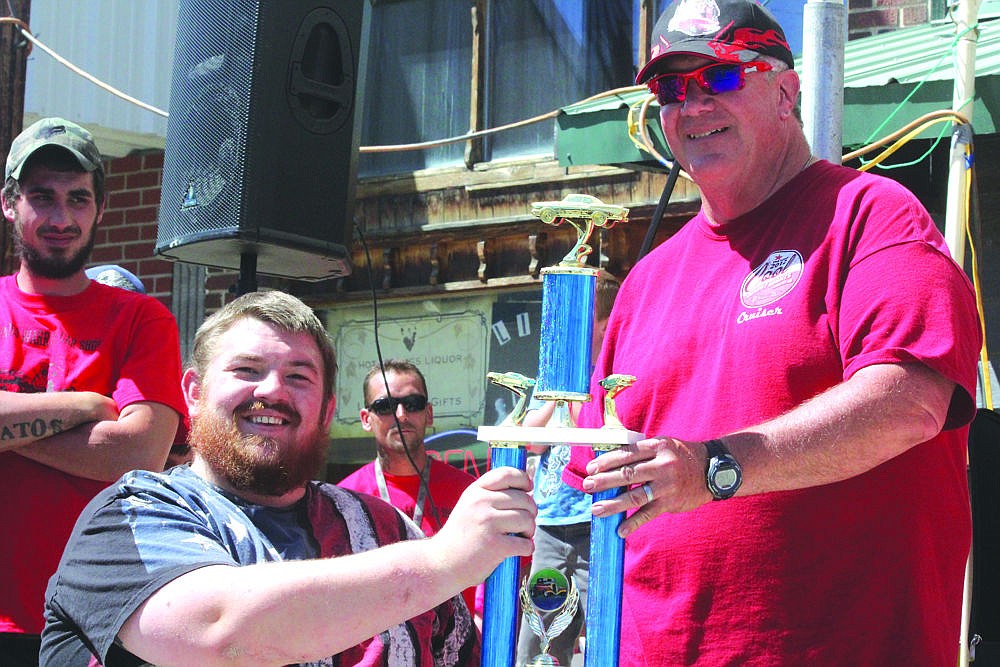 Tomy Parker (left) awards the Best in Show trophy to Paul Krueger (right). Parker, a Marine from Ronan, was the guest of honor at the Hot Springs Car Show this year. During the show Parker was surprised with his 1988 Dodge pickup, which the car show's organizers had completely refurbished with the help of donations from throughout the community.