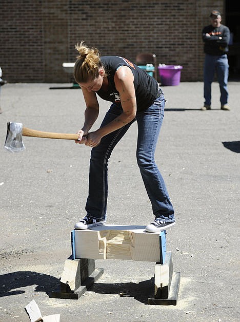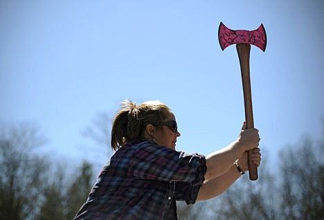 Harper and fellow Axe Woman Laurette Russell of New Gloucester, Maine, took turns throwing axes into a dart board-like target. Harper also took on longtime friend and Axe Woman Tracie Henning in the "underhand chop," in which competitors stand on thick blocks of wood and race to cut all the way through them, their axes swinging at targets just below their legs.