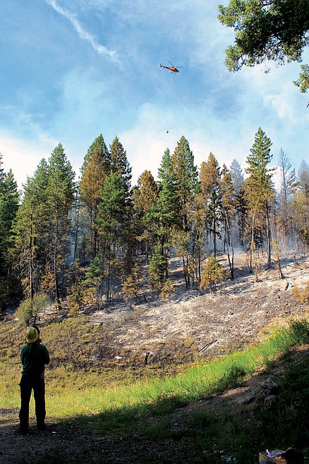 Bigfork, Creston and Ferndale fire departments responded, along with U.S. Forest Service vehicles and a helicopter from the Montana Department of Natural Resources and Conservation. About six engines initially responded along with three water tanks, and hand crews got to work building fire lines around the blaze on two flanks.