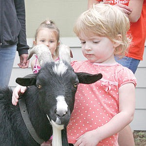 Vacation Bible school with three-year-old Hannah Hedge studying "Richochet," a Nigerian dwarf goat.