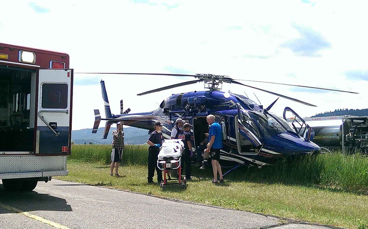 Kalispell Fire Department medical personnel transport three injured men from the Two Bear Air helicopter Tuesday at Kalispell City Airport. The men were airlifted from the Schafer Meadows Airstrip in the Great Bear Wilderness after their plane crashed. (Matt Hudson/Daily Inter Lake)