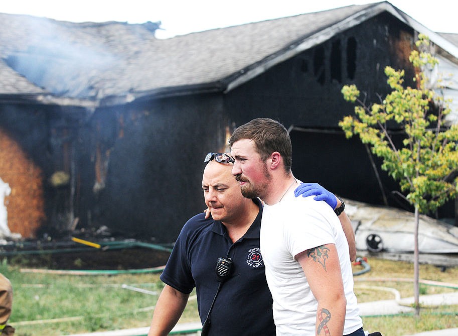 The man that rushed in the house to save the dogs is helped to the ambulance. (Aaric Bryan/Daily Inter Lake)