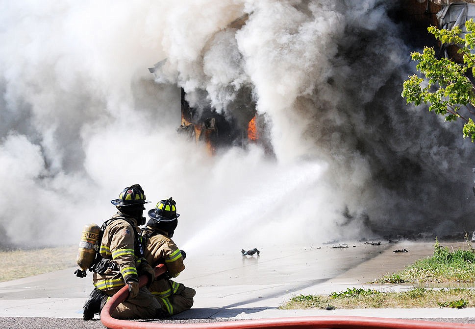 Firefighters hose down the garage of the burning home on Rockefeller Drive on Thursday. (Aaric Bryan/Daily Inter Lake)
