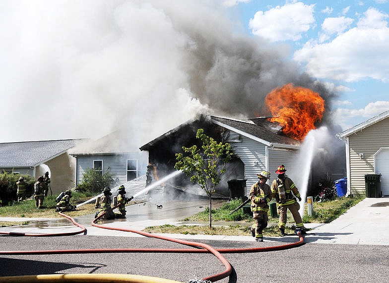 Firefighters extinguish the house fire in the Empire Estates on Thursday. (Aaric Bryan/Daily Inter Lake)