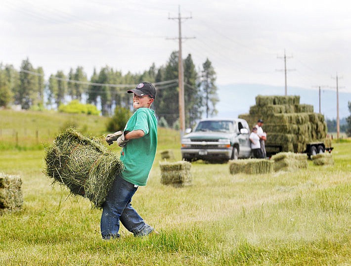 Noah Backen, 12, sets a hay bale in place and he and his 10-year-old brother Caleb Farmer helps their parents buck hay in a field off of Whitefish Stage Road on Thursday. (Aaric Bryan/Daily Inter Lake)