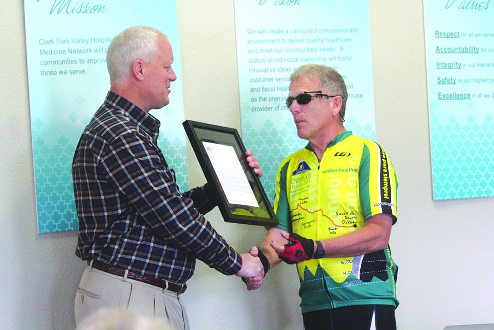 Dr. Gregory Hanson of Clark Fork Valley Hospital receives the "Improving Rural Health in the Americas" Recognition Award from Dr. Michael Heisler of Andean Health and Development.