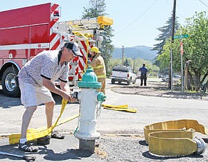 Steve Lauer hooks the hose to the hydrant Friday afternoon during the fire at 203 East Second St.