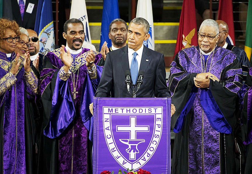 President Barack Obama speaks during services honoring the life of Rev. Clementa Pinckney, Friday, June 26, 2015, at the College of Charleston TD Arena in Charleston, S.C. Pinckney was one of the nine people killed in the shooting at Emanuel AME Church last week in Charleston. (AP Photo/David Goldman)