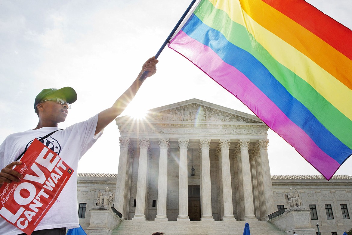 Carlos McKnight of Washington, waves a flag in support of gay marriage outside of the Supreme Court in Washington, Friday June 26, 2015. A major opinion on gay marriage is among the remaining to be released before the term ends at the end of June. (AP Photo/Jacquelyn Martin)