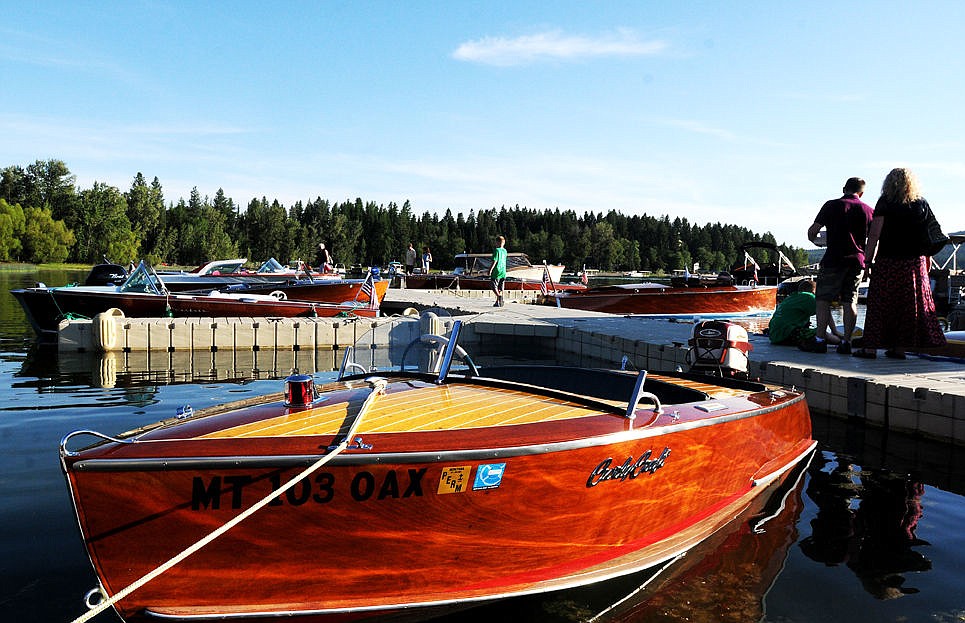 People view the wooden boats at the docks of the the Lodge at Whitefish Lake during the Whitefish Woody Weekend on Friday. (Aaric Bryan/Daily Inter Lake)