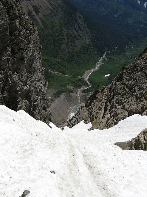 After failing to flag down sightseeing helicopters, Steele set out at 2 p.m. toward Margaret Lake, reclimbing the chute, crossing through a notch below the peak and dropping down the back side of a ridge.