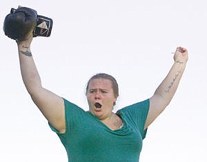 A triumphant Sarah Carpenter celebrates after defeating Sky Barry to claim the title of Bullette of the Woods Friday night during Logger Days 2015