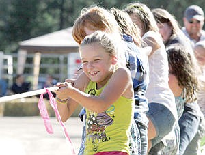 Friday night's tug-o-war, girls against boys with Nevaeh Pattie, 8, during Logger Days 2015.