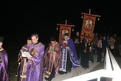 Those who attended the procession slowly walked around the church and stopped at each corner of the pathway to respond to the prayers of the priests and deacons. Jennifer Dancy of Post Falls carried an icon of her patron saint, St.Charitina of Amisus, who was martyred on Dancy's birthday.