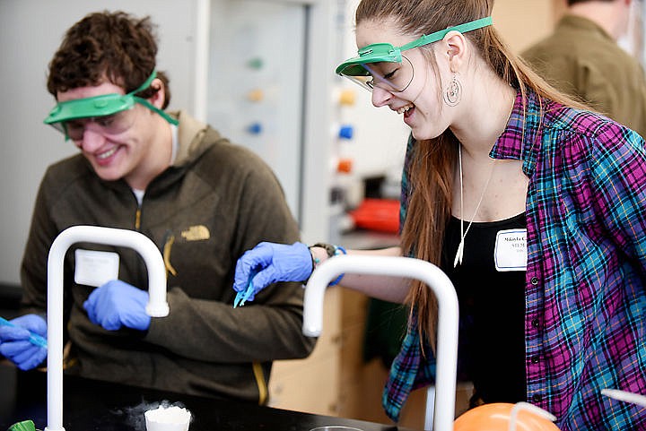 Mikayla Cardin and Clayton Clostio, juniors at Flathead High School, smile Tuesday as they do a chemistry project using liquid nitrogen at the seventh annual College for a Day event at Flathead Valley Community College. Approximately 800 high school juniors from around the Flathead Valley took part in the program.