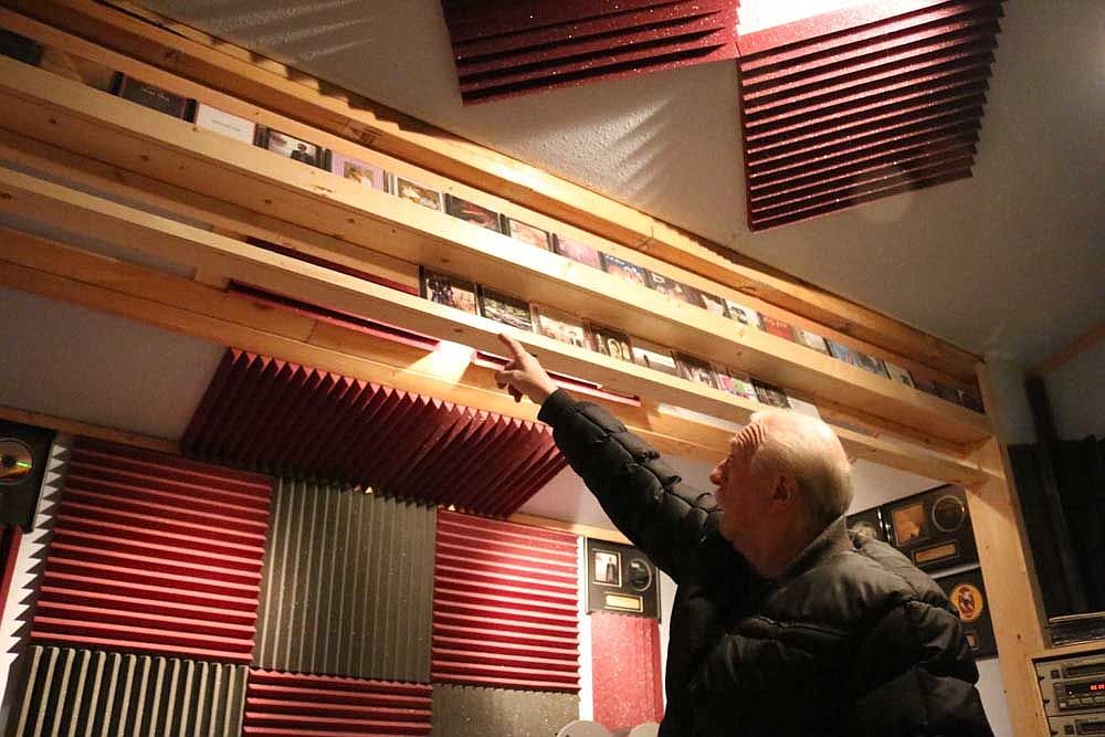 Chuck Seward points to CDs of artists he has recorded in his professional audio recording studio just outside Superior.