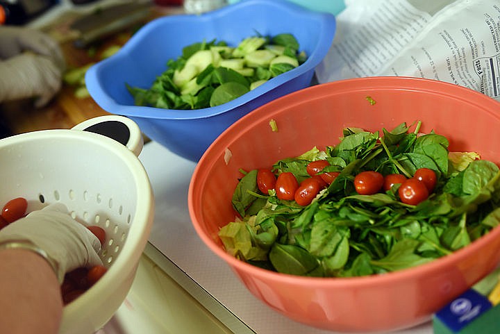 Karene Manus adds tomatoes to a spinach salad as she and others prepare for the once-a-month community dinner at the Canyon Elementary School on Thursday, February 26, in Hungry Horse. Vera Smith said they prefer to make dishes that are fresh and organic whenever possible. (Brenda Ahearn/Daily Inter Lake)