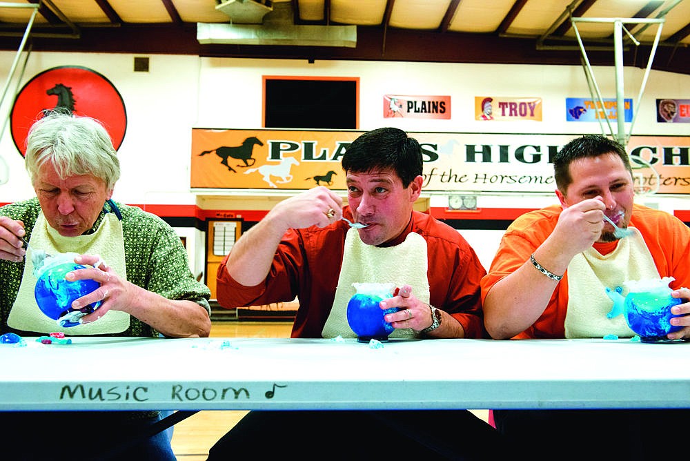 From left to right, Principal Larry McDonal, Superintendent Thom Chisholm and Tyrel Allen participate in a blue jello, whip cream and Swedish Fish eating contest last week in the school's gymnasium.