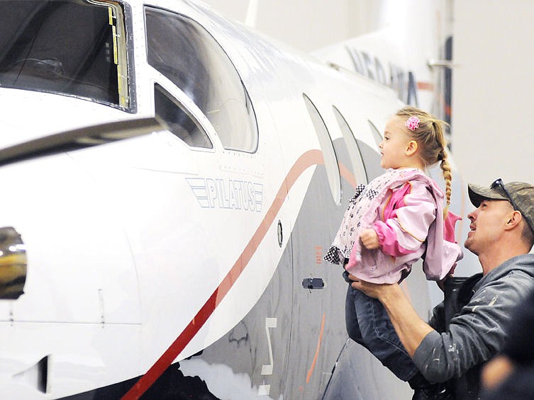 Blake Lindberg picks up Brynn so she can get a better view into the jet at the Glacier Jet Center on Saturday. (Aaric Bryan/Daily Inter Lake)