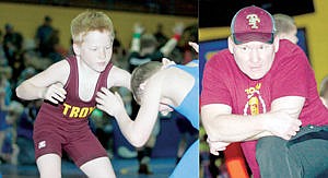 Marcus Hermes looks to make his move on Caleb Mee of Columbia Falls in the Beginner 65 class as his father Chris looks on Saturday during the Kootenai Klassic Little Guy wrestling tournament.