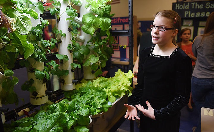 MaKenna Hartle, a sixth-grader, explains her project that compared hydroponics with aquaponics at the West Valley Science Fair on Monday. Last year, Hartle did a comparison of soil and hydroponics. In both cases she found that hydroponics worked better within the restrictions of her test, which was limited to a three-month trial. Hartle won the Reserve award in sixth-grade biological science.