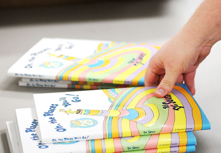 A father picks up a copy of "Oh, the Places You'll Go!". After reading the book to their child at the Read to Me Daddy program, the dads bring the book home to add to their family library. (Aaric Bryan/Daily Inter Lake)