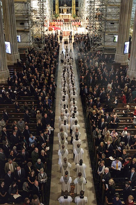 Inside, amid construction scaffolding for a yearslong renovation, solemn organ and vocal music accompanied several hundred Catholic clergy members, including almost a dozen cardinals and archbishops and about 30 bishops, as they walked slowly down the center aisle toward Egan's casket, draped in white and gold at the foot of the altar. Several of Egan's relatives took part in the Mass, some calling him Uncle Ed.