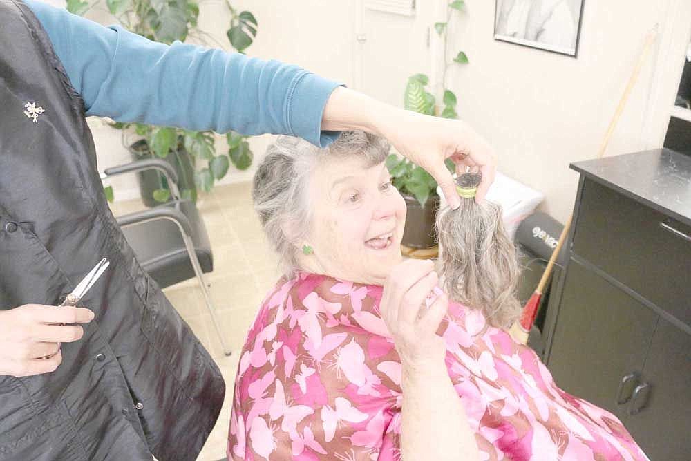 Carol Bidwell reacts after her ponytail was cut off last week at a local barber shop.