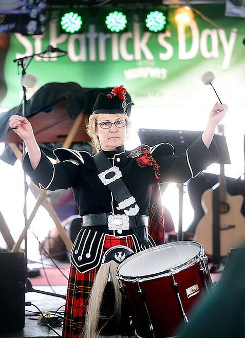JoDee Anderson on the tenor drum and other members of Montana Highlanders perform at the Brannigan's tent on March 17, 2014, as part of the St. Patrick's Day celebration. The Highlanders will return for the party this year.