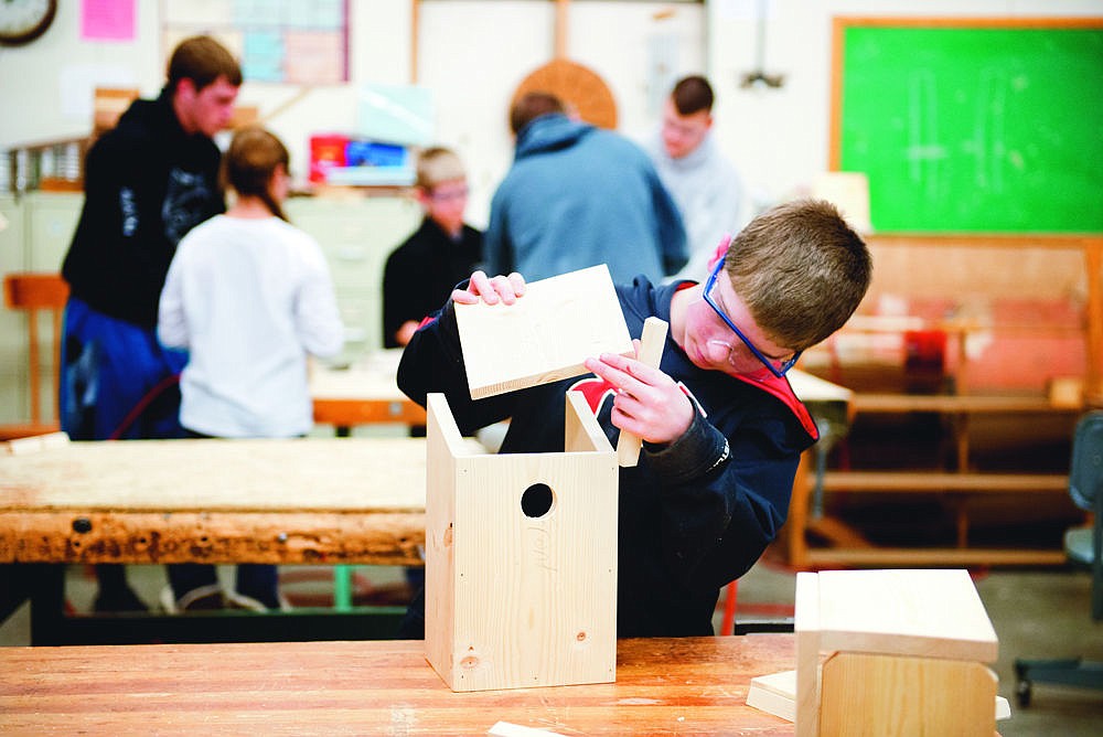 Kyle Lawson works on assembling the top to his bluebird birdhouse.