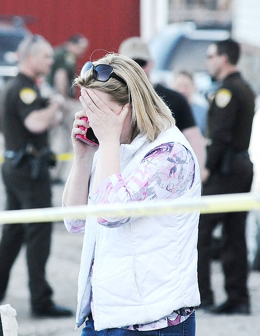 A woman who lives where two people were apparently shot talks on the phone as police investigate the scene southwest of Kalispell on Friday. (Aaric Bryan/Daily Inter Lake)