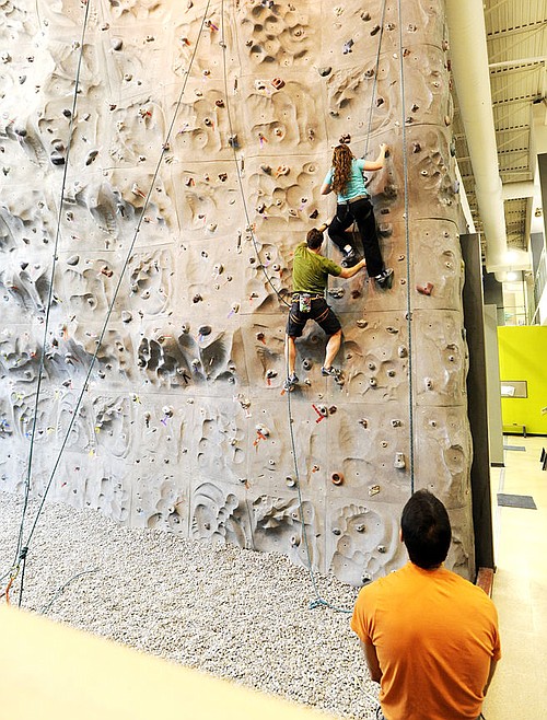 Emily Berner climbs the wall as Jandy Cox helps support her and Mik Sherman belays her at The Summit on Saturday. The three have been climbing the wall almost every Monday since November. (Aaric Bryan/Daily Inter Lake)