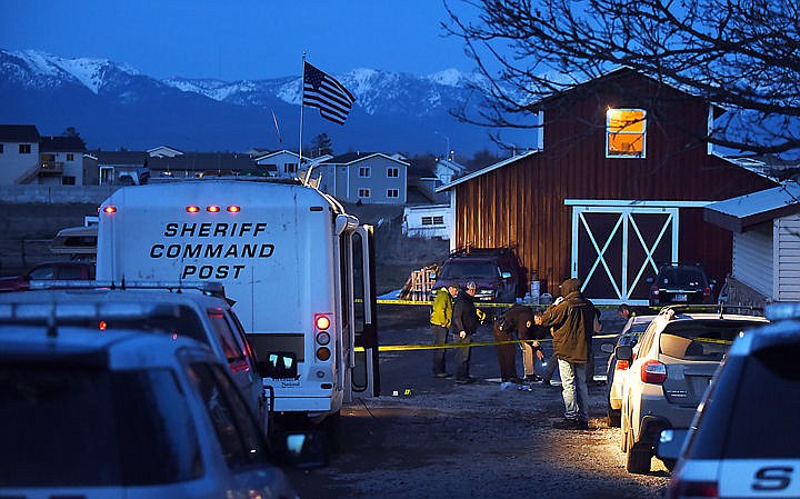 Members of the Flathead County Sheriff's Office investigate the scene of a shooting at 425 Valley View Drive on Friday evening, March 13, in Kalispell. One person has died as a result and the other has been treated and released. (Brenda Ahearn/Daily Inter Lake)