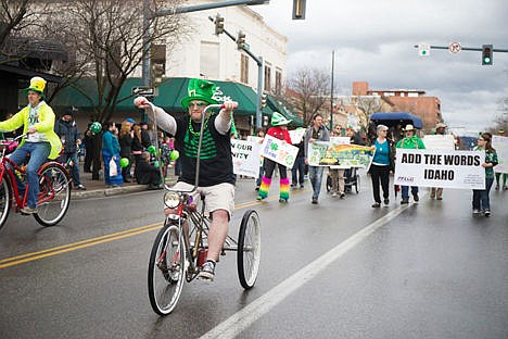 The 10th annual Downtown Association's St. Patrick's Day "Let's Hooley" parade included about 25 entries that piped, drummed, danced, rolled, trotted and marched along Sherman Avenue. The Coeur d'Alene Firefighters Pipes and Drums led the way, with appearances by Cherry Hill Park BMX, Ronald McDonald, the Snake Pit Derby Dames, PFLAG Coeur d'Alene, the Coeur d'Alene Chamber of Commerce, Irish wolfhounds, Irish setters, the guy in the Guinness can and more.